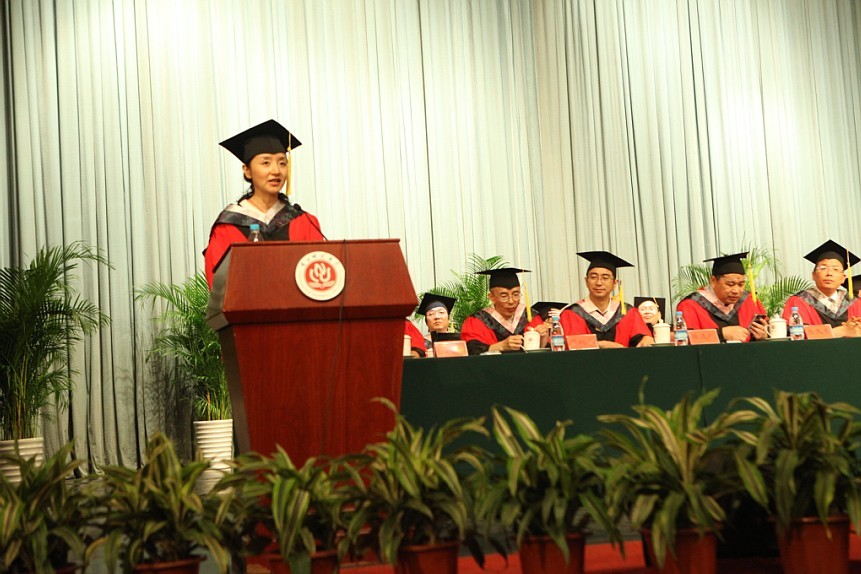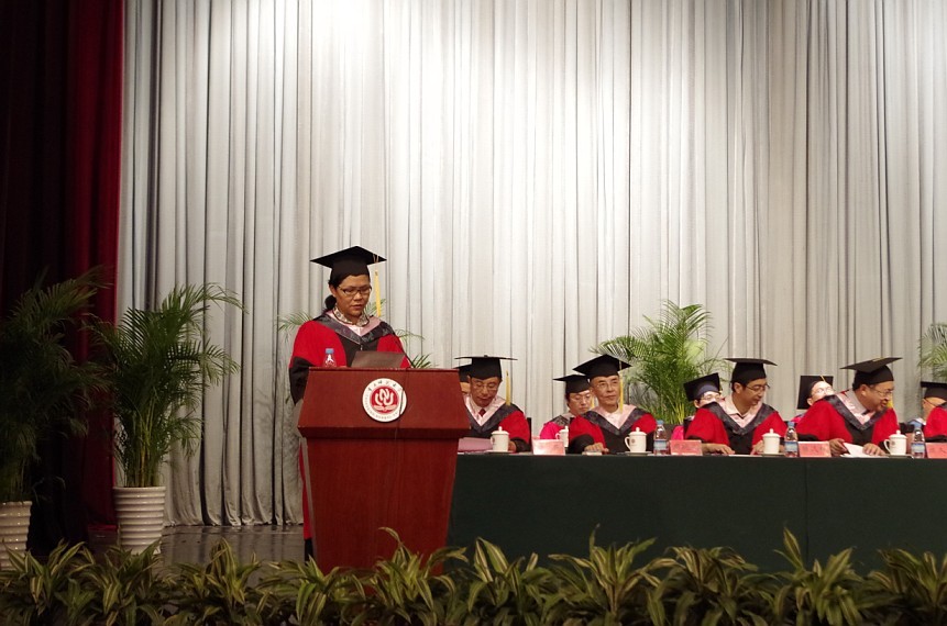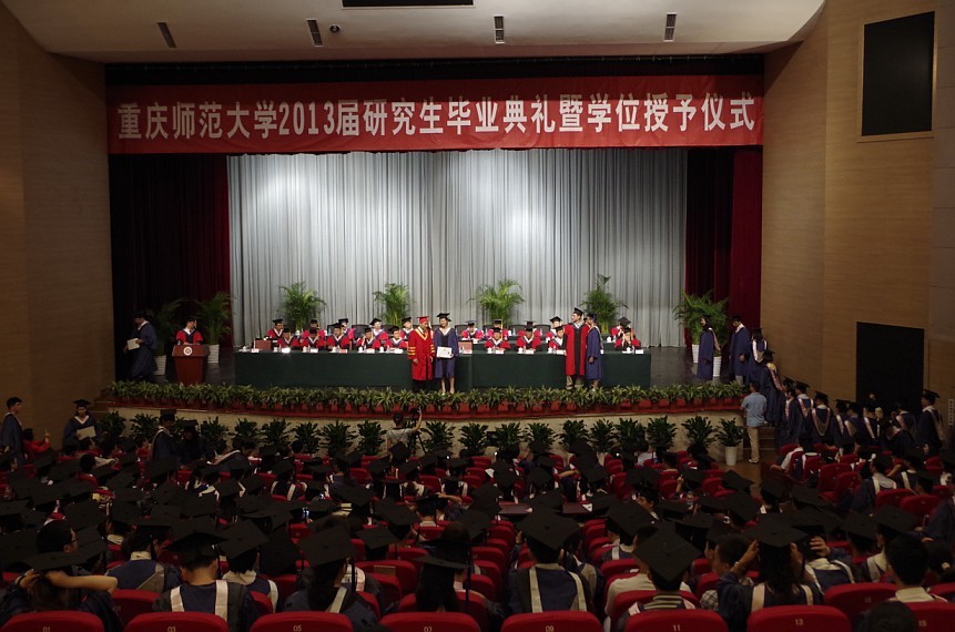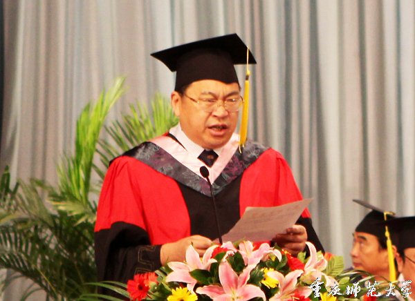 上午9点整,毕业典礼在庄严雄壮的国歌声中拉开帷幕。校学位评定委员会副主席、副校长董景荣教授宣读重庆师范大学学位委员会授位决议,授予魏雪玲等693名同学硕士学位。